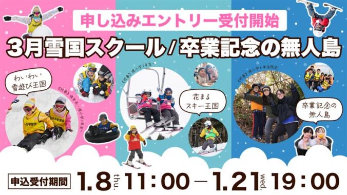 - 【お申し込みスタート!】3月末 春の野外体験「3月雪国スクール」「卒業記念の無人島」