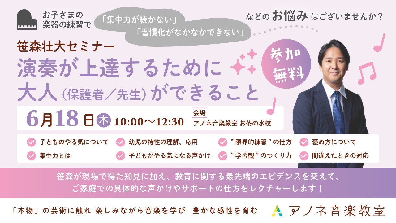 アノネ音楽教室代表 笹森壮大セミナー「演奏が上達するために大人(保護者/先生)ができること」