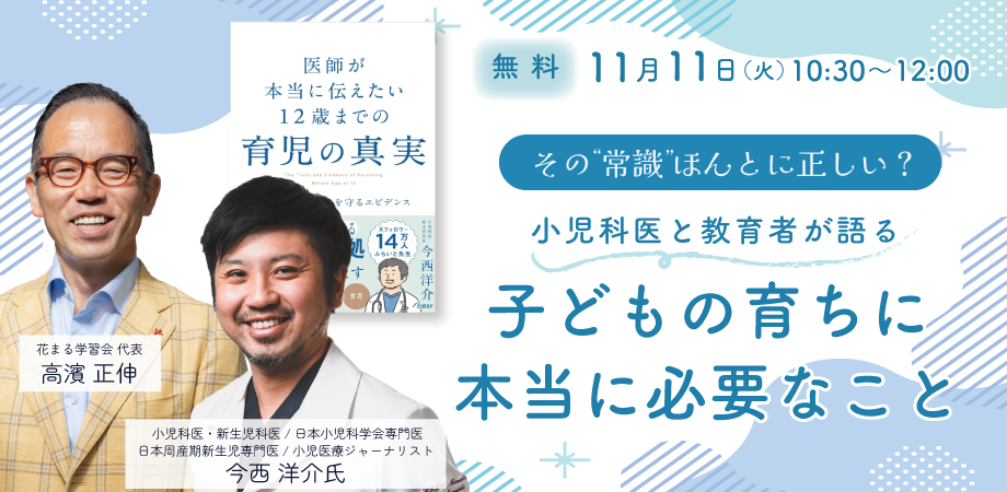 【花まる子育てカレッジ 対談ライブ】11/11(火)@オンライン|今西洋介氏×高濱正伸「その“常識”、ほんとに正しい? 小児科医と教育者が語る、子どもの育ちに本当に必要なこと」【Zoomライブ配信】