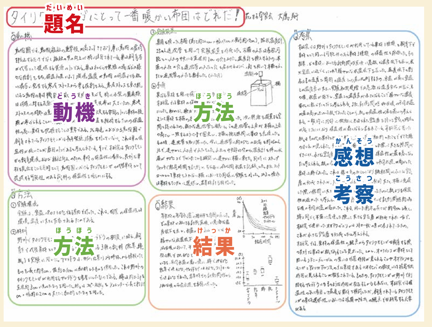 キミの研究内容を一言で書こう! 難しく考えすぎず、自分の言葉で大丈夫。読む人がわくわくするような題名をつけよう!