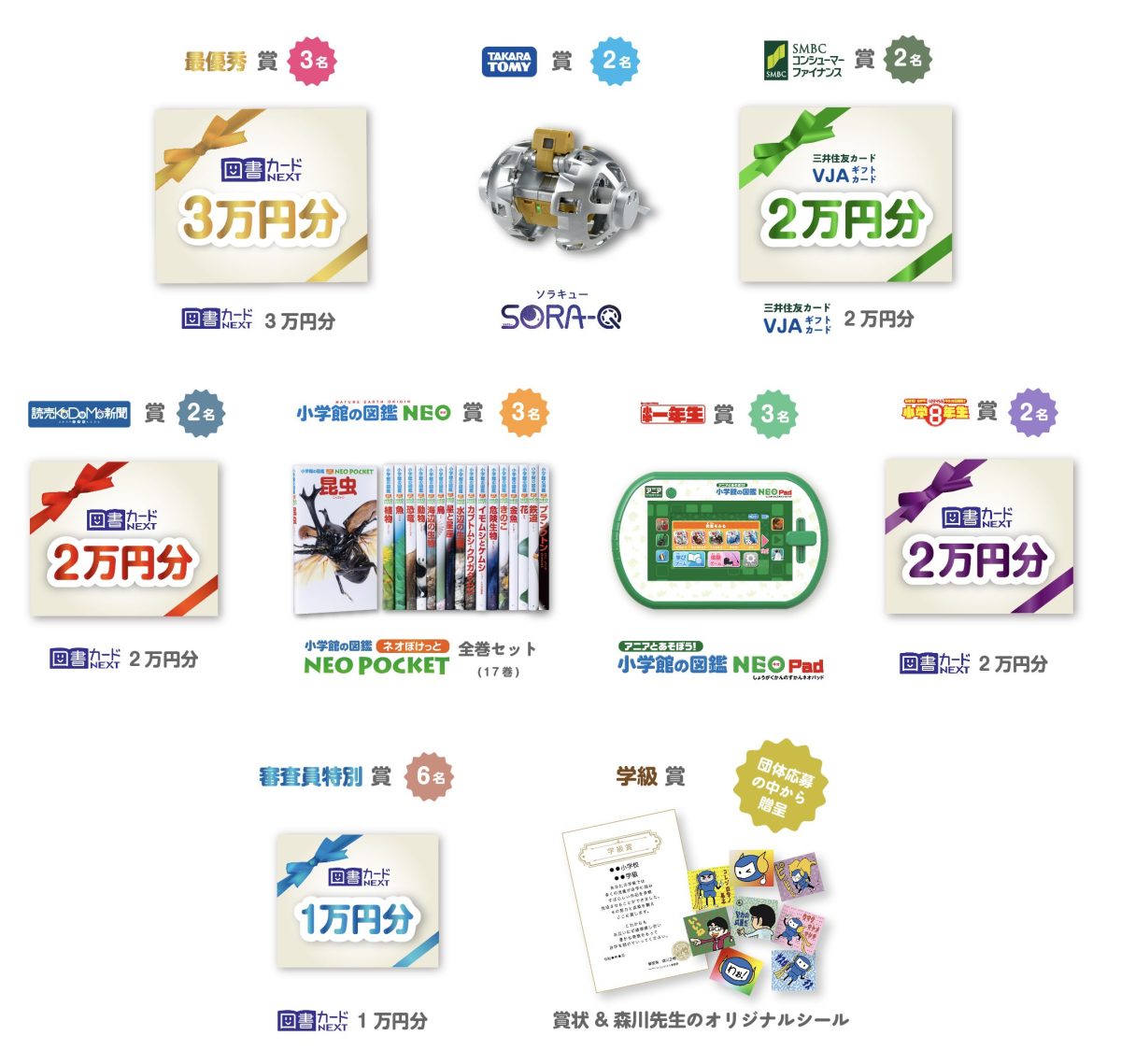 優秀作品には、図書カード3万円分をはじめ、超小型の変形型月面ロボット「SORA-Q(ソラキュー)」や、全国50万店以上で利用できる全国共通商品券「VJAギフトカード」2万円分など豪華賞品が贈られます。