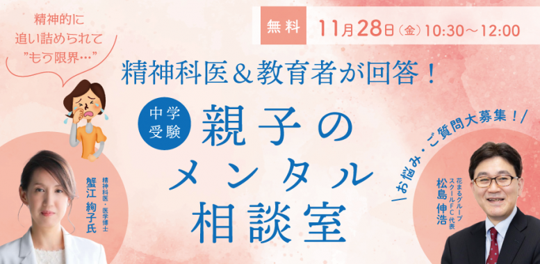 - 【花まる子育てカレッジ 対談ライブ】11/28(金)@オンライン|蟹江絢子×松島伸浩「精神的に追い詰められて ”もう限界…” 精神科医&教育者が回答!中学受験 親子のメンタル相談室 〜お悩み・ご質問大募集!〜」【Zoomライブ配信】