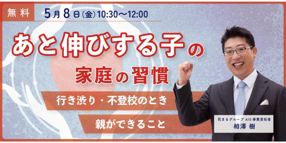 本講演では、花まるAll Inclusive School(花まるAIS)の創設者であり、花まるグループ AIS事業責任者の相澤樹 が、行き渋り・不登校という状況を「問題」ではなく、子どもが次の成長段階へ向かうサインとして捉え直しながら、家庭でできる具体的な関わりかたをお話しします。
