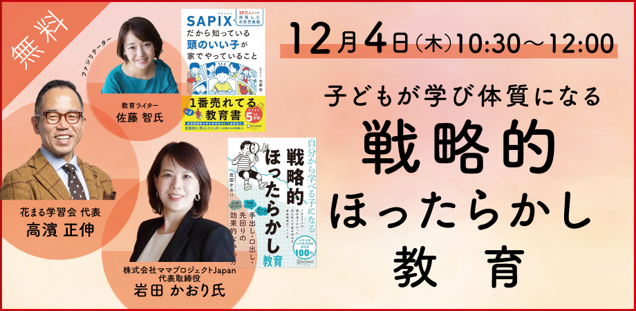 『自分から学べる子になる戦略的ほったらかし教育』(ディスカヴァー・トゥエンティワン)の著者で家庭教育の専門家 岩田かおり氏と高濱との対談。『SAPIXだから知っている 頭のいい子が家でやっていること』(ディスカヴァー・トゥエンティワン)で知られる教育ライターの佐藤 智氏が司会を務めてくださいます。子育てや教育の現場で培ってきた豊富な知見を交わす対談です!