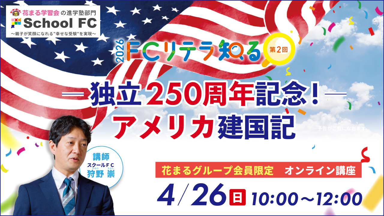 スクールFC精鋭講師による探究型オンライン講座。第2回は「実験国家」アメリカを学びます。ぜひご家族でご参加ください!