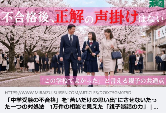- 【掲載情報】「中学受験の不合格」を"苦いだけの思い出"にさせないたった一つの対処法 1万件の相談で見えた「親子談話の力」|未来図