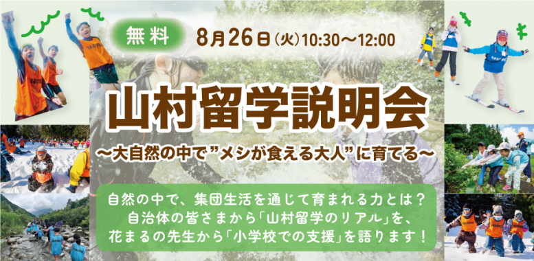 - 【花まる子育てカレッジ】8/26(火)@オンライン|「山村留学説明会 ~大自然の中で”メシが食える大人”に育てる~」【Zoomライブ配信】