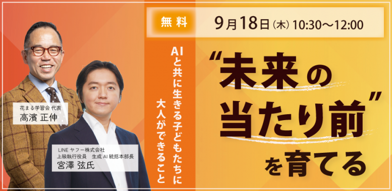 - 【花まる子育てカレッジ 対談ライブ】9/18(木)@オンライン|宮澤弦氏 × 高濱正伸「“未来の当たり前”を育てる 〜AIと共に生きる子どもたちに、大人ができること~」【Zoomライブ配信】