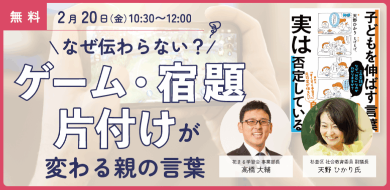 - 【花まる子育てカレッジ 対談ライブ】2/20(金)@オンライン|天野ひかり氏 × 高橋大輔「なぜ伝わらない? ゲーム・宿題・片付けが変わる親の言葉」【Zoomライブ配信】