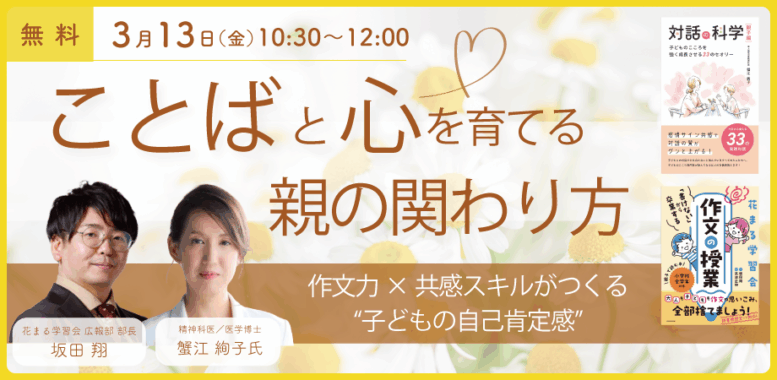 - 【花まる子育てカレッジ 対談ライブ】3/13(金)@オンライン|蟹江絢子 × 坂田翔「ことばと心を育てる親の関わり方 ~作文力 × 共感スキルがつくる”子どもの自己肯定感”~」【Zoomライブ配信】