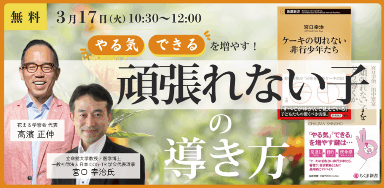 - 【花まる子育てカレッジ 対談ライブ】3/17(金)@オンライン|宮口幸治氏 × 高濱正伸「”やる気””できる”を増やす! 頑張れない子の導き方」【Zoomライブ配信】
