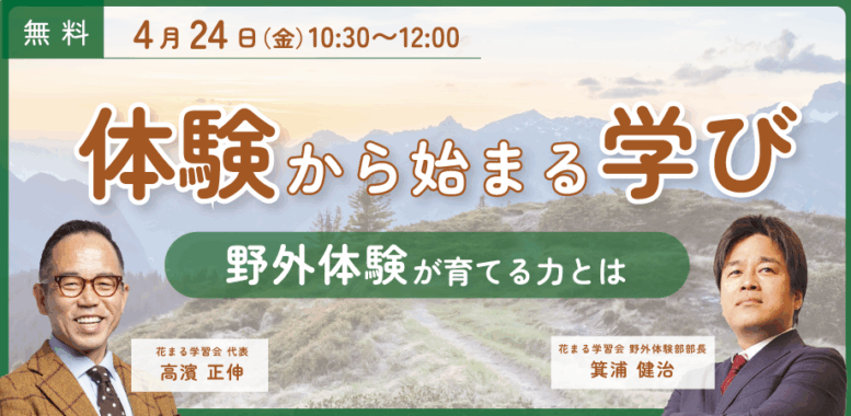 - 【花まる子育てカレッジ 対談ライブ】4/24(金)@オンライン|高濱正伸 × 箕浦健治「体験から始まる学び──野外体験が育てる力とは」【Zoomライブ配信】