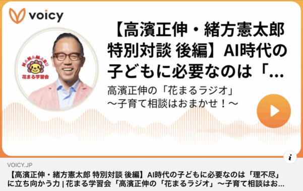- Voicy社長の緒方氏をお招きしました!|【高濱正伸・緒方憲太郎 特別対談 後編】AI時代の子どもに必要なのは「理不尽」に立ち向かう力