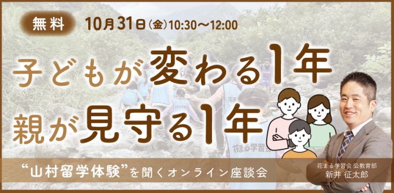 - 【花まる子育てカレッジ 対談ライブ】10/31(金)@オンライン|新井征太郎「子どもが変わる1年、親が見守る1年 ― 山村留学体験を聞くオンライン座談会」【Zoomライブ配信】