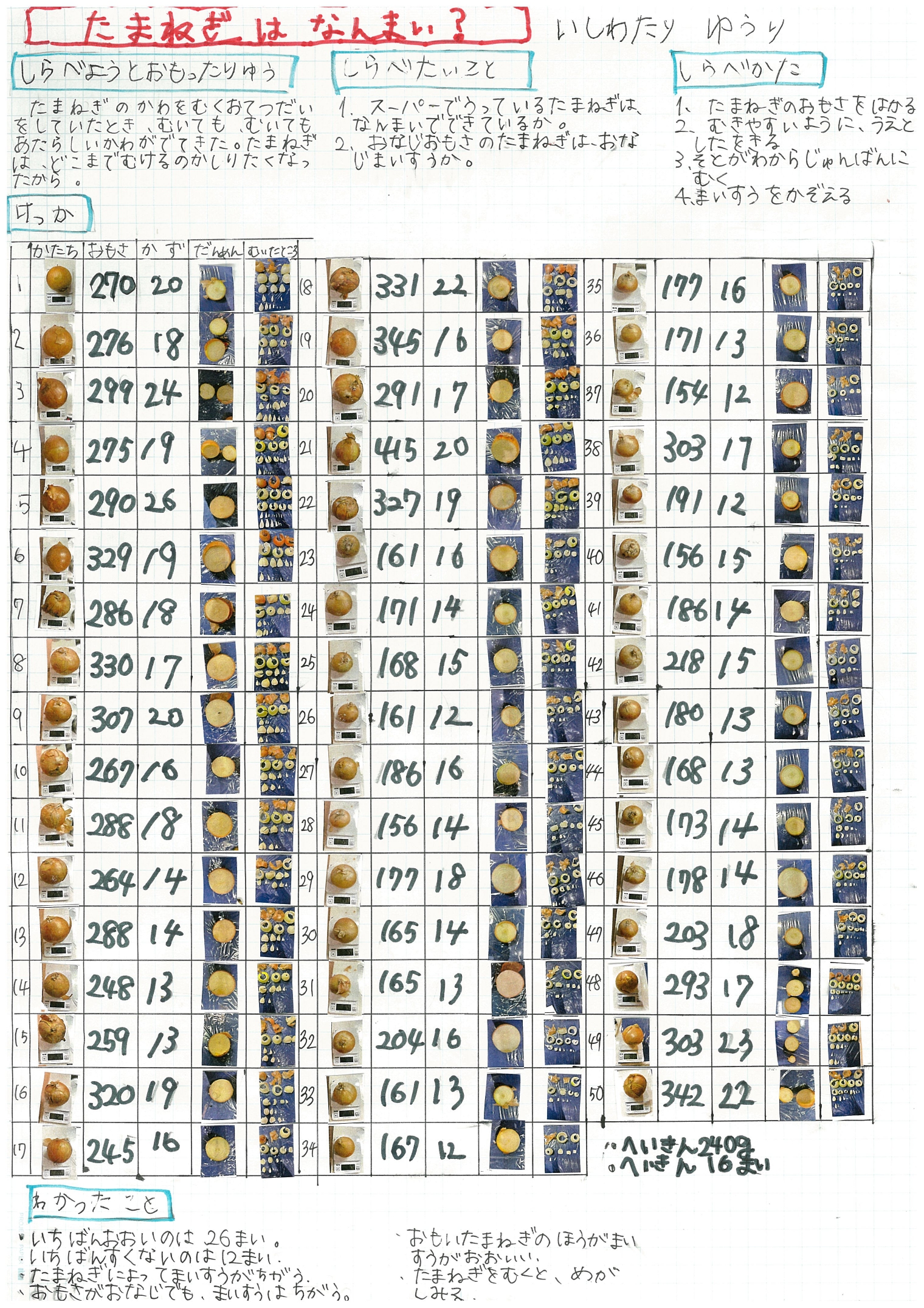 作品を見た瞬間、玉ねぎ50個分の写真と数字の迫力に圧倒されました。多くの人が見過ごすであろう「玉ねぎは何層になっているのか」という点に着目し、重さと層の数を自分の手で調べきった点が秀逸です。大量データを集める根気強さに加え、結果をインパクトある形で整理したまとめ方もすばらしい。努力・着眼点・表現力がそろった作品です。