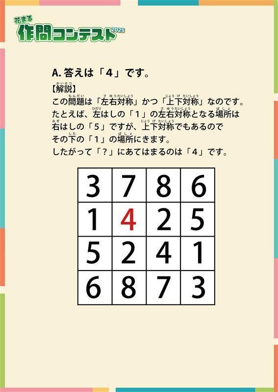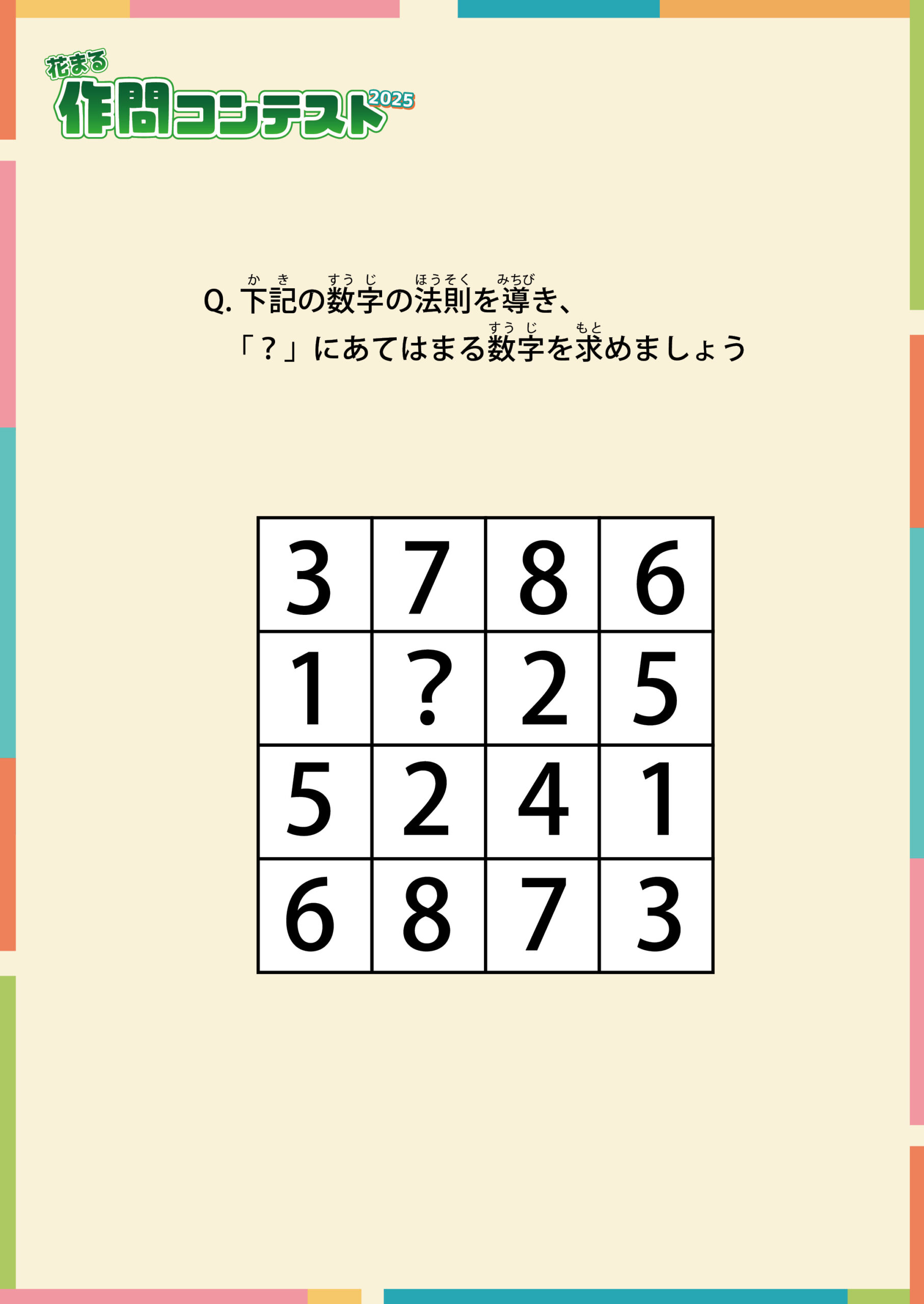 気づいたときには法則を見つけようと考えはじめてしまう、子どもたちが前のめりになれる問題です。「これしかない!」と解が定まる瞬間の爽快感を味わい、自分でも問題を作ってみようと手を動かしはじめる子がたくさんいるのではないでしょうか。