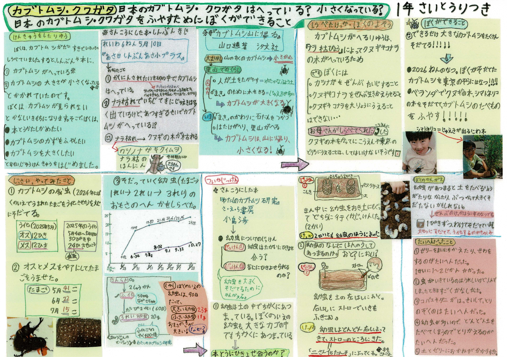 なんと、応募期間よりずっと前からこの研究は始まっています。日頃から知りたいことに一直線で、探究を続ける姿勢に感服しました。研究の途中で生まれた疑問を放置せず、追加実験で確かめながら深めていった点が、完成度を一段上げています。カブトムシ・クワガタムシへの深い愛情が原動力となり、学びを自分の手で広げていった、熱量と探究心あふれる作品です。